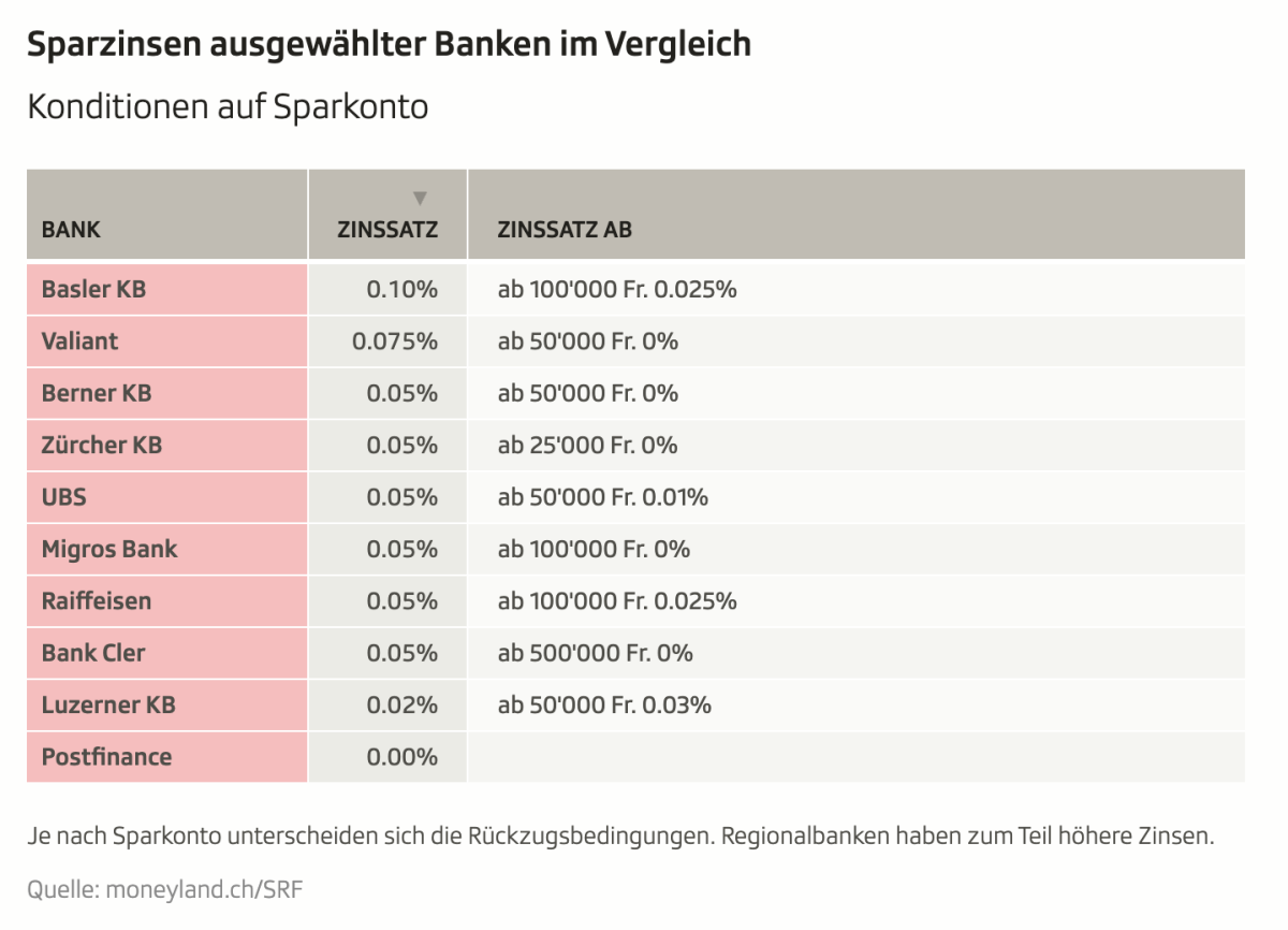 Die Banken sind jedoch derzeit an grossen Beträgen auf dem Sparkonto nicht interessiert. Auch bei Postfinance gibt es auf dem normalen Sparkonto gar nichts mehr.